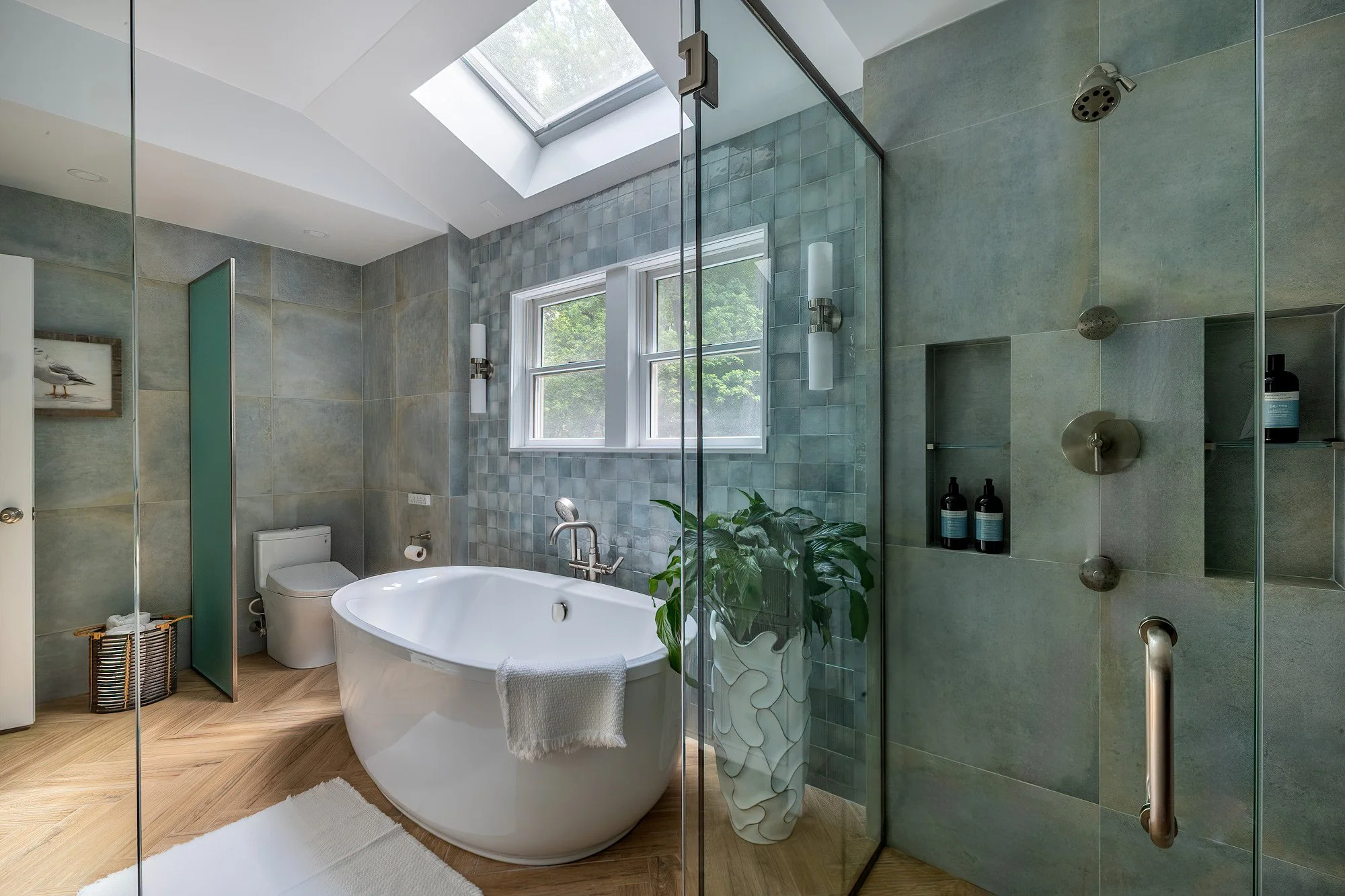 The layout was re-imagined to maximize light and space. The free-standing soaking tub is perfectly positioned under a skylight and large windows, creating a bright and airy atmosphere. The walk-in shower is enclosed by a single sheet of glass, making the room feel more open while maintaining a distinct, luxurious shower area.